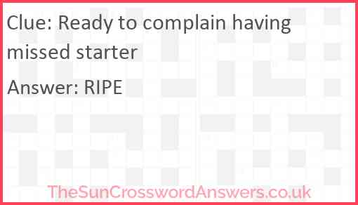 Ready to complain having missed starter is a crossword clue for which we have 1 possible answer and we have spotted 2 times in our database. This crossword clue was last seen on 12 June 2022 in The Sun Cryptic Crossword puzzle!