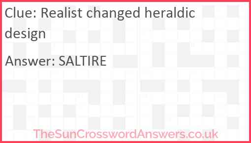 Realist changed heraldic design is a crossword clue for which we have 1 possible answer and we have spotted 1 times in our database. This crossword clue was last seen on 31 October 2021 in The Sun Cryptic Crossword puzzle!