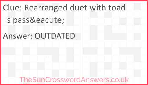 Rearranged duet with toad is passé is a crossword clue for which we have 1 possible answer and we have spotted 1 times in our database. This crossword clue was last seen on 03 December 2018 in The Sun Cryptic Crossword puzzle!