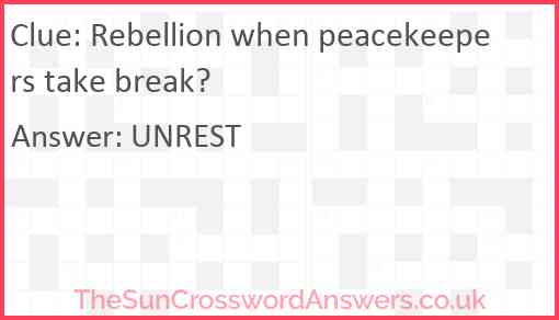 Rebellion when peacekeepers take break? is a crossword clue for which we have 1 possible answer and we have spotted 2 times in our database. This crossword clue was last seen on 27 May 2023 in The Sun Cryptic Crossword puzzle!