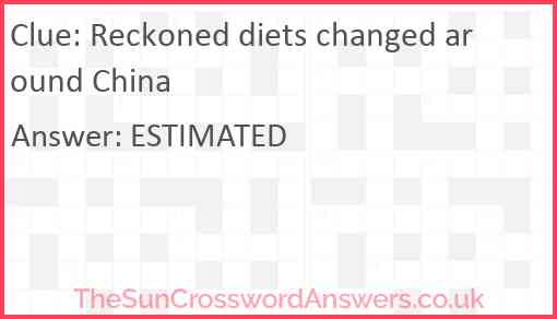 Reckoned diets changed around China is a crossword clue for which we have 1 possible answer and we have spotted 2 times in our database. This crossword clue was last seen on 12 April 2023 in The Sun Cryptic Crossword puzzle!
