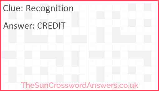 Recognition is a crossword clue for which we have 1 possible answer and we have spotted 10 times in our database. This crossword clue was last seen on 29 January 2025 in The Sun Coffee Time Crossword puzzle!