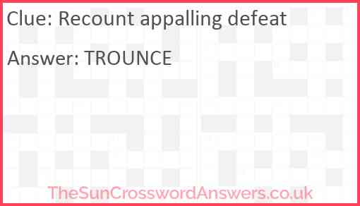 Recount appalling defeat is a crossword clue for which we have 1 possible answer and we have spotted 3 times in our database. This crossword clue was last seen on 26 December 2023 in The Sun Cryptic Crossword puzzle!