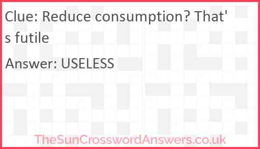 Reduce consumption? That's futile is a crossword clue for which we have 1 possible answer and we have spotted 2 times in our database. This crossword clue was last seen on 02 March 2025 in The Sun Cryptic Crossword puzzle!