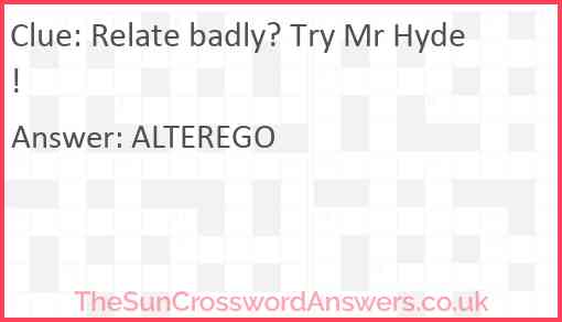Relate badly? Try Mr Hyde! is a crossword clue for which we have 1 possible answer and we have spotted 3 times in our database. This crossword clue was last seen on 06 April 2025 in The Sun Cryptic Crossword puzzle!