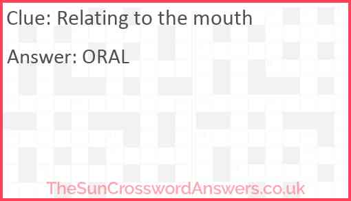 Relating to the mouth is a crossword clue for which we have 1 possible answer and we have spotted 4 times in our database. This crossword clue was last seen on 27 April 2022 in The Sun Coffee Time Crossword puzzle!