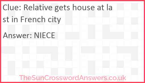 Relative gets house at last in French city is a crossword clue for which we have 1 possible answer and we have spotted 2 times in our database. This crossword clue was last seen on 14 May 2023 in The Sun Cryptic Crossword puzzle!
