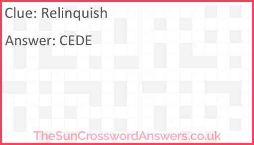 Relinquish is a crossword clue for which we have 1 possible answer and we have spotted 10 times in our database. This crossword clue was last seen on 21 March 2025 in The Sun Coffee Time Crossword puzzle!