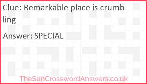 Remarkable place is crumbling is a crossword clue for which we have 1 possible answer and we have spotted 2 times in our database. This crossword clue was last seen on 11 June 2023 in The Sun Cryptic Crossword puzzle!