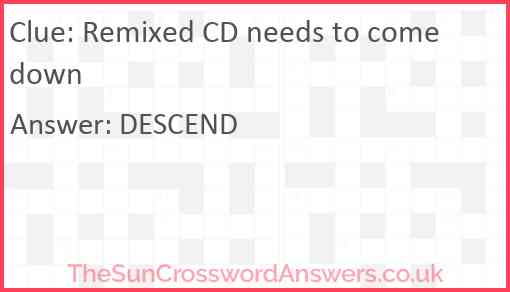 Remixed CD needs to come down is a crossword clue for which we have 1 possible answer and we have spotted 1 times in our database. This crossword clue was last seen on 06 May 2021 in The Sun Cryptic Crossword puzzle!
