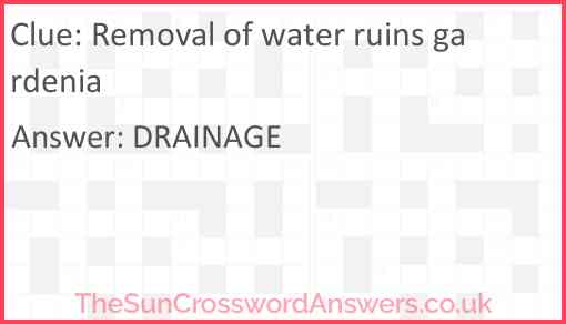 Removal of water ruins gardenia is a crossword clue for which we have 1 possible answer and we have spotted 3 times in our database. This crossword clue was last seen on 12 May 2024 in The Sun Cryptic Crossword puzzle!