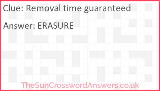 Removal time guaranteed is a crossword clue for which we have 1 possible answer and we have spotted 3 times in our database. This crossword clue was last seen on 24 September 2024 in The Sun Cryptic Crossword puzzle!