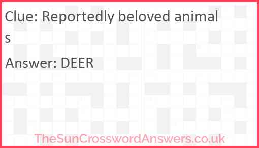 Reportedly beloved animals is a crossword clue for which we have 1 possible answer and we have spotted 1 times in our database. This crossword clue was last seen on 12 August 2023 in The Sun Cryptic Crossword puzzle!