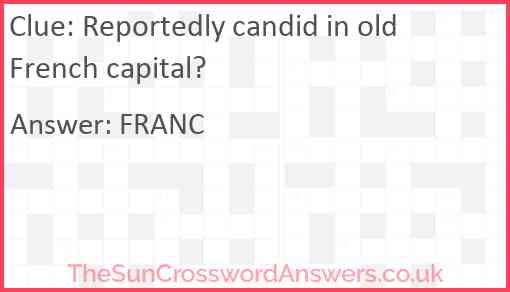 Reportedly candid in old French capital? is a crossword clue for which we have 1 possible answer and we have spotted 2 times in our database. This crossword clue was last seen on 03 February 2023 in The Sun Cryptic Crossword puzzle!
