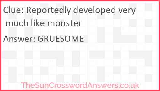 Reportedly developed very much like monster is a crossword clue for which we have 1 possible answer and we have spotted 2 times in our database. This crossword clue was last seen on 05 February 2023 in The Sun Cryptic Crossword puzzle!