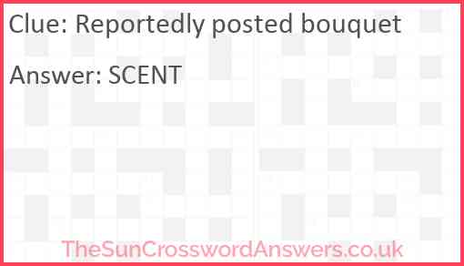 Reportedly posted bouquet is a crossword clue for which we have 1 possible answer and we have spotted 2 times in our database. This crossword clue was last seen on 21 July 2024 in The Sun Cryptic Crossword puzzle!