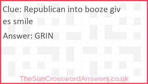 Republican into booze gives smile is a crossword clue for which we have 1 possible answer and we have spotted 1 times in our database. This crossword clue was last seen on 14 February 2020 in The Sun Cryptic Crossword puzzle!