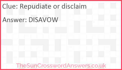 Repudiate or disclaim is a crossword clue for which we have 1 possible answer and we have spotted 2 times in our database. This crossword clue was last seen on 23 September 2023 in The Sun Coffee Time Crossword puzzle!