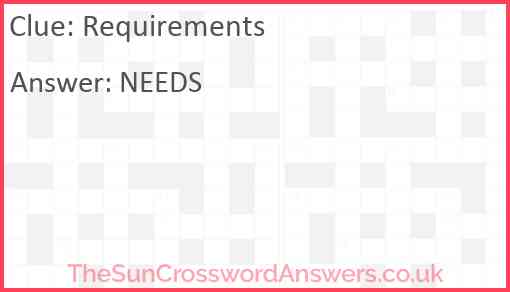 Requirements is a crossword clue for which we have 1 possible answer and we have spotted 4 times in our database. This crossword clue was last seen on 26 February 2025 in The Sun Coffee Time Crossword puzzle!