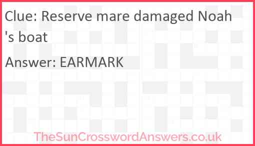 Reserve mare damaged Noah's boat is a crossword clue for which we have 1 possible answer and we have spotted 1 times in our database. This crossword clue was last seen on 11 April 2024 in The Sun Cryptic Crossword puzzle!