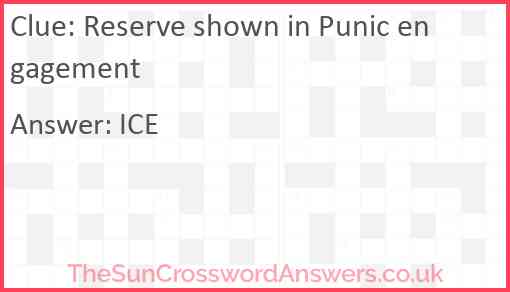 Reserve shown in Punic engagement is a crossword clue for which we have 1 possible answer and we have spotted 2 times in our database. This crossword clue was last seen on 04 September 2022 in The Sun Cryptic Crossword puzzle!