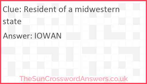 Resident of a midwestern state is a crossword clue for which we have 1 possible answer and we have spotted 1 times in our database. This crossword clue was last seen on 09 April 2020 in The Sun Coffee Time Crossword puzzle!