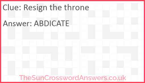 Resign the throne is a crossword clue for which we have 1 possible answer and we have spotted 3 times in our database. This crossword clue was last seen on 28 August 2022 in The Sun Coffee Time Crossword puzzle!