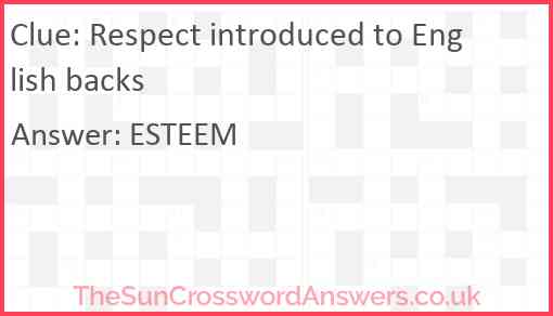 Respect introduced to English backs is a crossword clue for which we have 1 possible answer and we have spotted 2 times in our database. This crossword clue was last seen on 19 July 2025 in The Sun Cryptic Crossword puzzle!