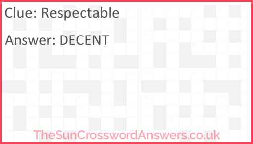 Respectable is a crossword clue for which we have 1 possible answer and we have spotted 6 times in our database. This crossword clue was last seen on 19 April 2024 in The Sun Coffee Time Crossword puzzle!