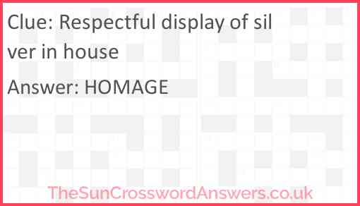 Respectful display of silver in house is a crossword clue for which we have 1 possible answer and we have spotted 2 times in our database. This crossword clue was last seen on 01 July 2022 in The Sun Cryptic Crossword puzzle!