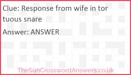 Response from wife in tortuous snare is a crossword clue for which we have 1 possible answer and we have spotted 3 times in our database. This crossword clue was last seen on 13 March 2025 in The Sun Cryptic Crossword puzzle!