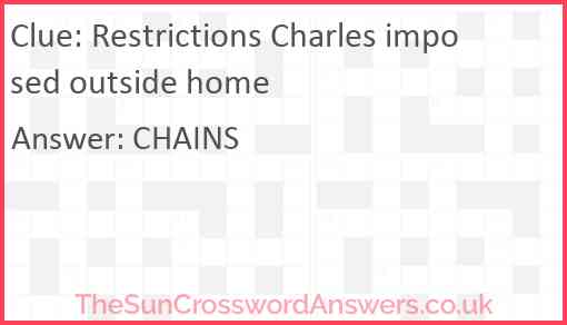 Restrictions Charles imposed outside home is a crossword clue for which we have 1 possible answer and we have spotted 1 times in our database. This crossword clue was last seen on 16 June 2024 in The Sun Cryptic Crossword puzzle!