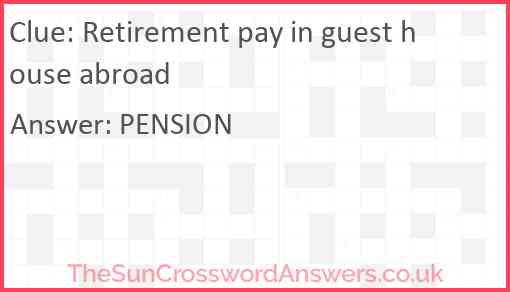 Retirement pay in guest house abroad is a crossword clue for which we have 1 possible answer and we have spotted 3 times in our database. This crossword clue was last seen on 19 September 2023 in The Sun Cryptic Crossword puzzle!