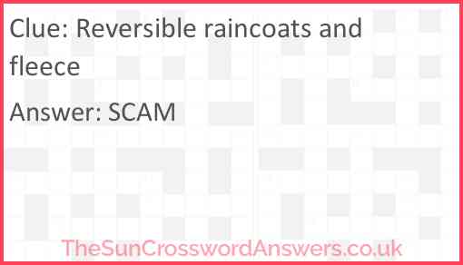 Reversible raincoats and fleece is a crossword clue for which we have 1 possible answer and we have spotted 3 times in our database. This crossword clue was last seen on 06 May 2023 in The Sun Cryptic Crossword puzzle!