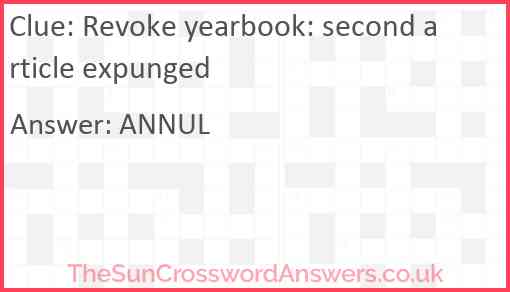 Revoke yearbook: second article expunged is a crossword clue for which we have 1 possible answer and we have spotted 2 times in our database. This crossword clue was last seen on 19 December 2024 in The Sun Cryptic Crossword puzzle!