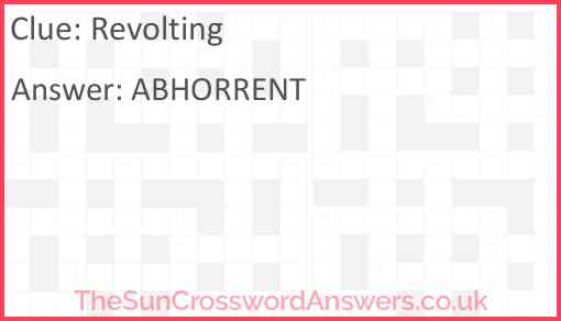 Revolting is a crossword clue for which we have 1 possible answer and we have spotted 12 times in our database. This crossword clue was last seen on 07 June 2025 in The Sun Coffee Time Crossword puzzle!