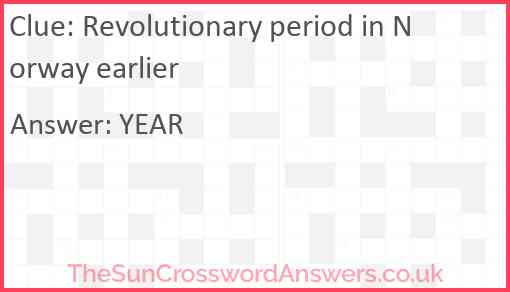 Revolutionary period in Norway earlier is a crossword clue for which we have 1 possible answer and we have spotted 2 times in our database. This crossword clue was last seen on 24 December 2022 in The Sun Cryptic Crossword puzzle!