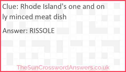 Rhode Island's one and only minced meat dish is a crossword clue for which we have 1 possible answer and we have spotted 1 times in our database. This crossword clue was last seen on 18 May 2023 in The Sun Cryptic Crossword puzzle!