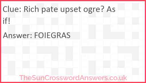 Rich pate upset ogre? As if! is a crossword clue for which we have 1 possible answer and we have spotted 2 times in our database. This crossword clue was last seen on 20 October 2024 in The Sun Cryptic Crossword puzzle!