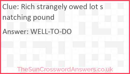 Rich strangely owed lot snatching pound is a crossword clue for which we have 2 possible answer and we have spotted 2 times in our database. This crossword clue was last seen on 31 May 2023 in The Sun Cryptic Crossword puzzle!