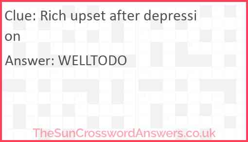 Rich upset after depression is a crossword clue for which we have 1 possible answer and we have spotted 1 times in our database. This crossword clue was last seen on 21 December 2022 in The Sun Cryptic Crossword puzzle!
