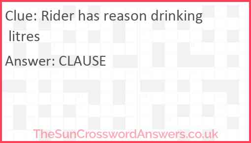 Rider has reason drinking litres is a crossword clue for which we have 1 possible answer and we have spotted 1 times in our database. This crossword clue was last seen on 13 August 2024 in The Sun Cryptic Crossword puzzle!