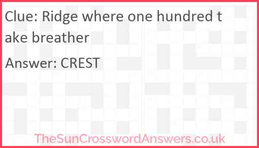 Ridge where one hundred take breather is a crossword clue for which we have 1 possible answer and we have spotted 3 times in our database. This crossword clue was last seen on 10 July 2025 in The Sun Cryptic Crossword puzzle!