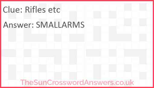 Rifles etc is a crossword clue for which we have 1 possible answer and we have spotted 1 times in our database. This crossword clue was last seen on 17 October 2024 in The Sun Coffee Time Crossword puzzle!
