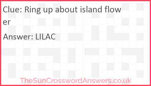 Ring up about island flower is a crossword clue for which we have 1 possible answer and we have spotted 2 times in our database. This crossword clue was last seen on 25 October 2022 in The Sun Cryptic Crossword puzzle!