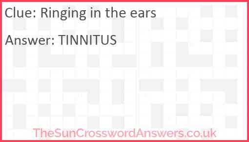 Ringing in the ears is a crossword clue for which we have 1 possible answer and we have spotted 2 times in our database. This crossword clue was last seen on 28 December 2022 in The Sun Coffee Time Crossword puzzle!