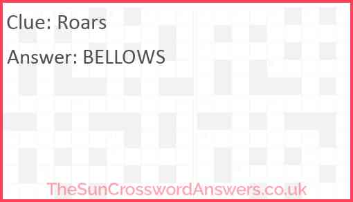 Roars is a crossword clue for which we have 1 possible answer and we have spotted 1 times in our database. This crossword clue was last seen on 25 August 2022 in The Sun Coffee Time Crossword puzzle!