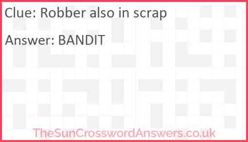 Robber also in scrap is a crossword clue for which we have 1 possible answer and we have spotted 4 times in our database. This crossword clue was last seen on 11 March 2025 in The Sun Cryptic Crossword puzzle!
