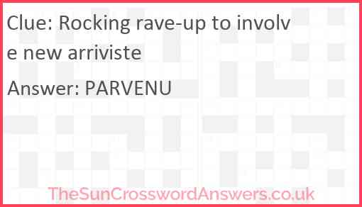 Rocking rave-up to involve new arriviste is a crossword clue for which we have 1 possible answer and we have spotted 1 times in our database. This crossword clue was last seen on 09 February 2025 in The Sun Cryptic Crossword puzzle!