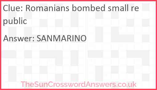Romanians bombed small republic is a crossword clue for which we have 1 possible answer and we have spotted 1 times in our database. This crossword clue was last seen on 09 May 2020 in The Sun Cryptic Crossword puzzle!